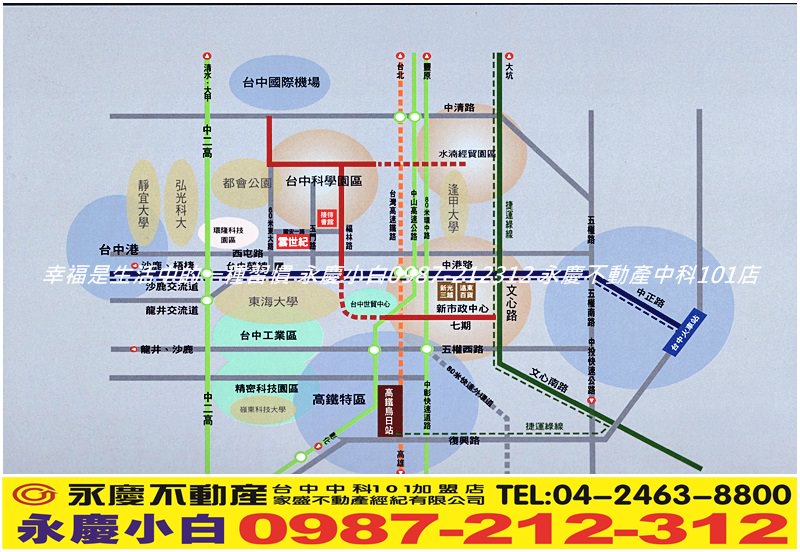 ▲周邊交通台中港路是台中市最重要的主要道路。而中科特區的這段台中港路擁有的優勢是其它地段所不能比擬的!我們擁有全部的交通系統:國道一號、國道三號、中彰快速道路、高鐵烏日站、台中港、清泉崗國際機場、特三號快速道路;這些便捷的交通網絡系統,車程全在30分鐘內可以抵達,甚至10分鐘內就能輕鬆南上北下,若未來捷運系統規劃完成,整個中科特區的交通將是全台灣最便捷最完整的中心,地理優勢傲人。