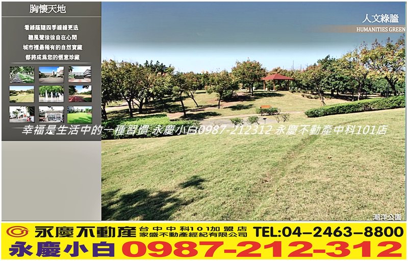 「惠宇禮仁」公園綠地:逢甲公園、文修公園、環保減碳公園、秋紅谷生態公園、潮洋環保公園、超多公園綠地。