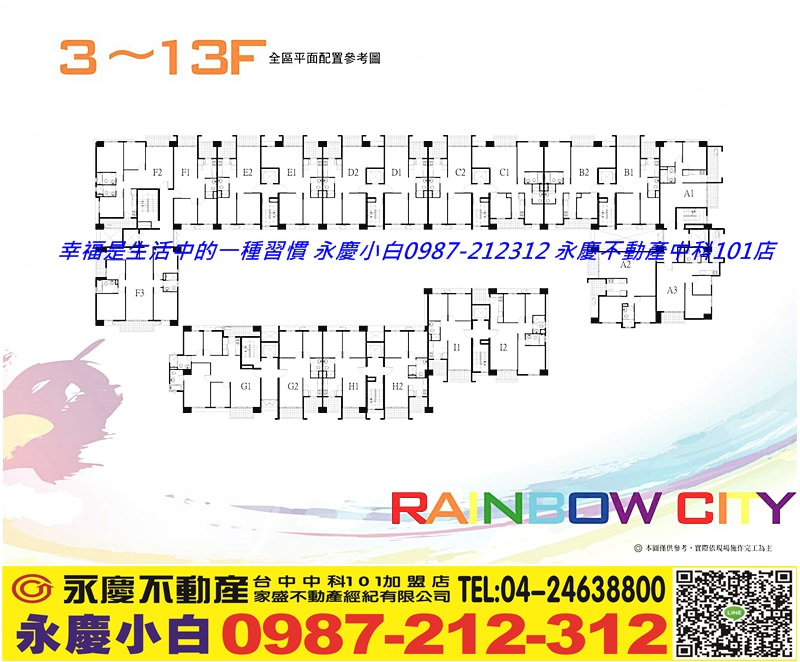 「勝美彩虹城1期」標準層3~13樓,西側棟別規劃2個3併與4個雙併住家,東側棟為3個雙併,2棟皆為28~48坪、2~4房。現場銷售人員蔡昇杰說:「目前台中市區首購大樓以3~4房為主,本案是市場上少見規劃2房的新案。