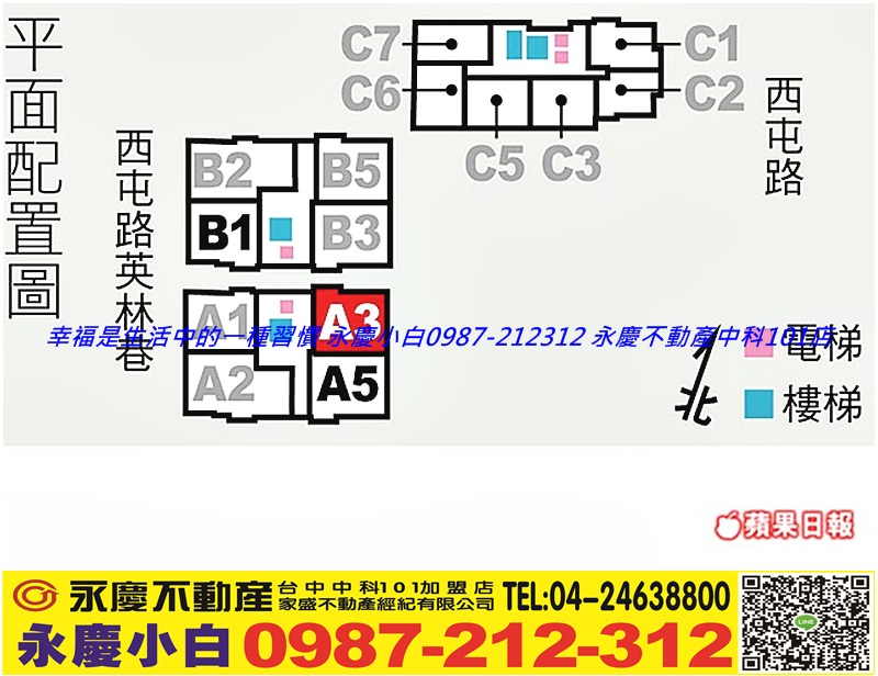 ◆棟別規劃:全案規劃A、B、C共 3棟大樓,A棟為地上14樓、B棟地上13樓,均為每層4戶、24~33坪、2~3房。C棟地上12樓,坪數18~20坪、均為1房。全案1房共有66戶、2房75戶、3房僅25戶。