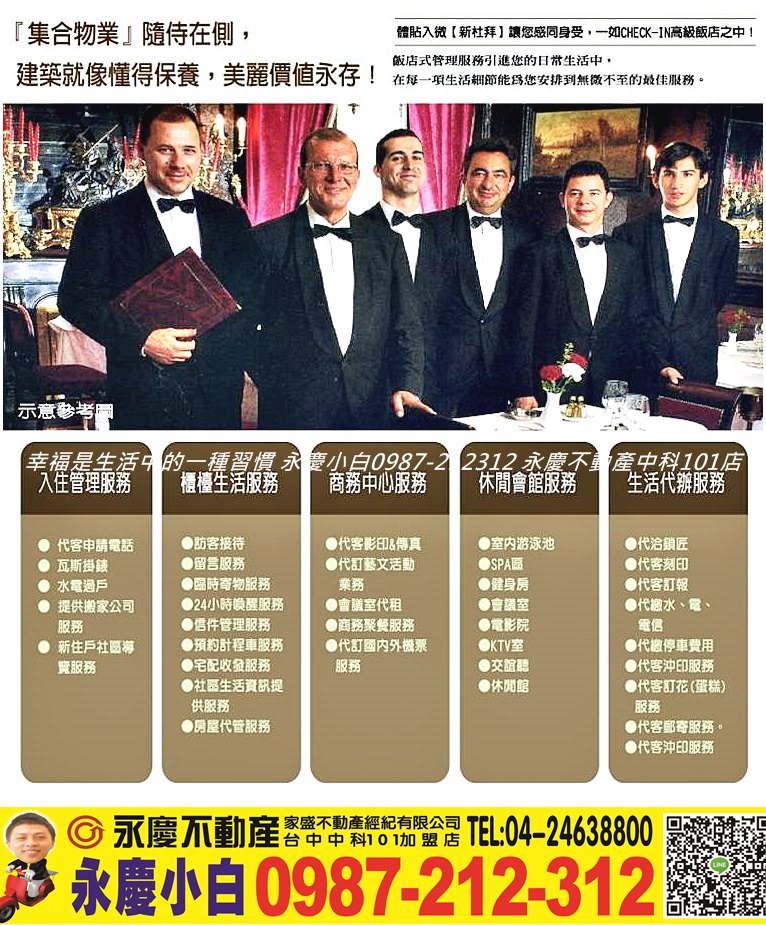 本團隊已在大台中中科深耕數十多年於中科、嶺東、逢甲、5期、7期、8期、12期、新10期聯賣超強優值銷售團隊,同仁約有400位菁英戰將同仁同步銷售,是台中最強、最快銷售團隊,若是您有買賣屋..等不動產任何需求歡迎您找小白。也懇請您能給我們機會為您服務。