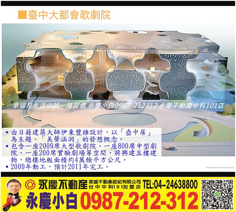 世界九大地標台中國家大都會歌劇院已完工,後勢絕對看漲,七期名人巷環境清幽、新古典建築歌劇院特區。極致奢華頂級公設、身分與地位象徵,鄰新市政、大遠百、新光三越、新市政議會、新市政中心、老虎城、秋紅谷生態公園、夏綠地。