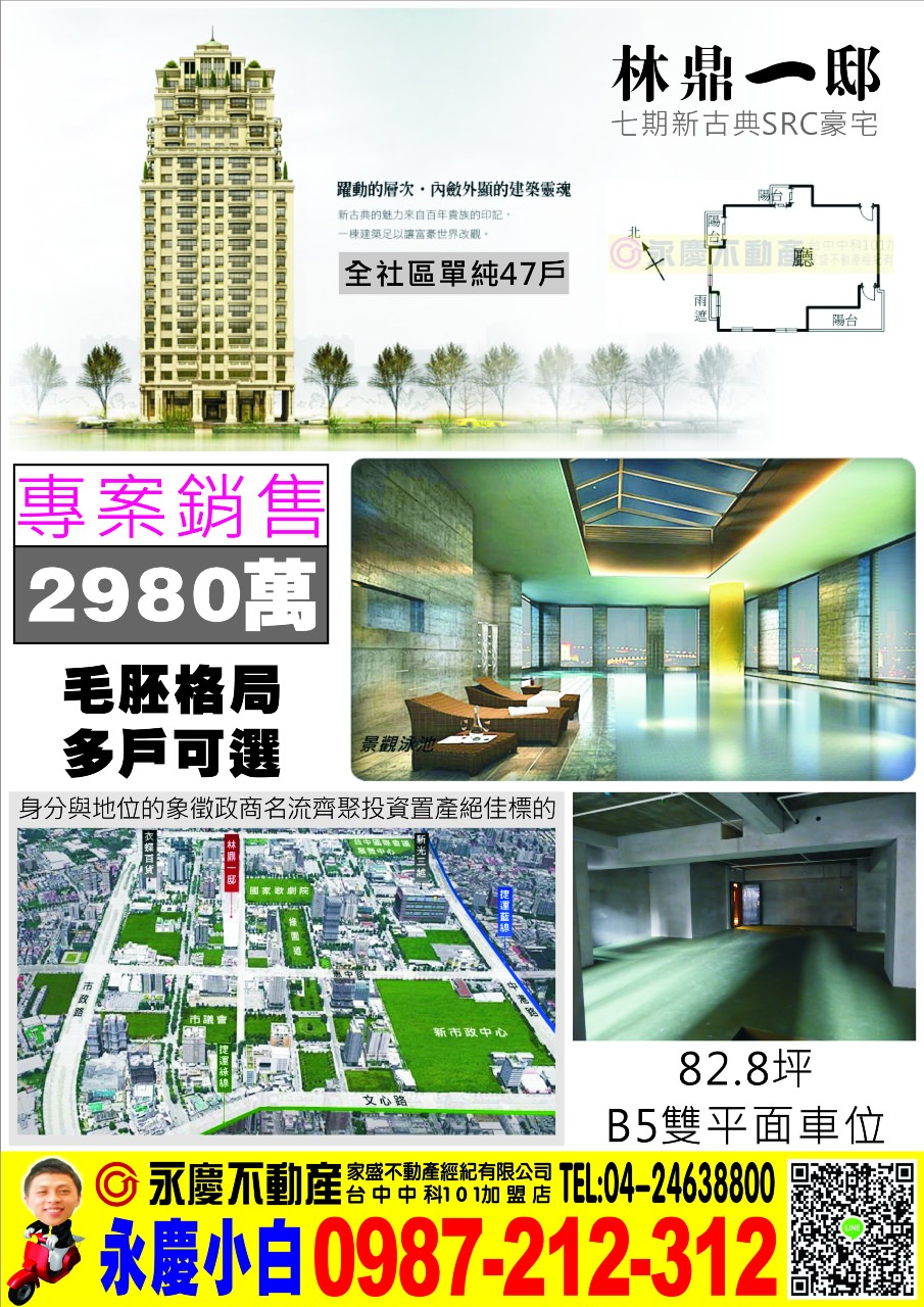 「林鼎一邸」新古典風格,讓市政北二路上多了一棟不朽又漂亮的建築,全社區單純47戶,更具傳家風範。本案採毛胚交屋,可讓您自行規劃設計,SRC外加新日鐵制震UBB+VEM,剛柔並濟的完美建築,中空樓地板.日本YKK氣密窗.隔熱及防紫外線效果佳的Low-E玻璃。
