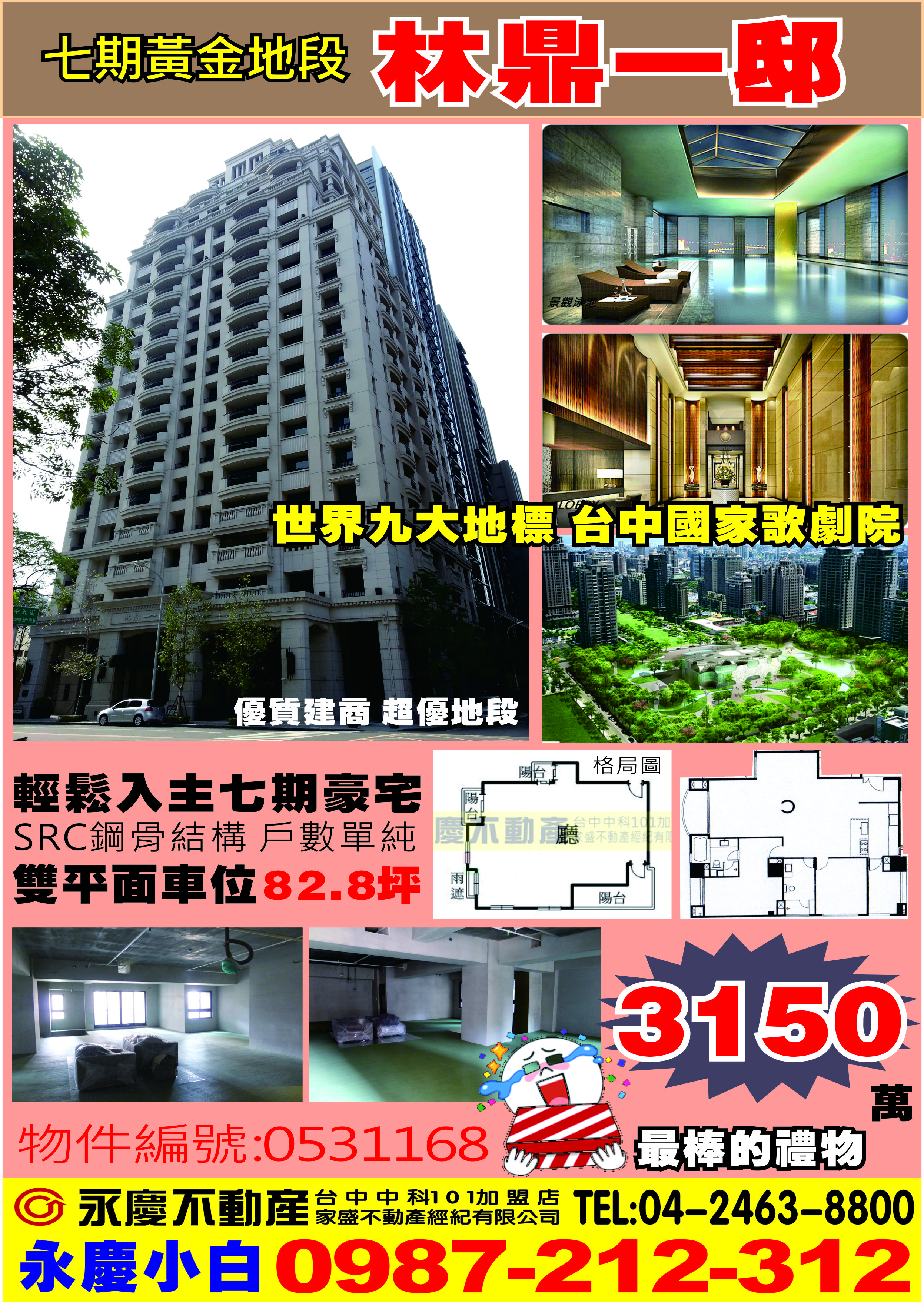 七期最精華地段市政北二路,七期名人巷,在這樣的地段居然可以找到3字頭的單價,地段,增值,隔壁國泰推案都在6十幾萬了,甚至連台中最外圍北屯大坑都直逼3十來萬,我們的建案無論房子條件使用的建材、建設公司、地點、保值、增值、住戶水準、高品質管理不是那些建案所可比較的,社區多企業大老闆總裁政商名流…等入住, 豪宅風格遠遠超過8期、12期…等許多地段,價格卻相對的便宜,趁現在屋主有意願割愛給有眼光的您,不然真的是賣掉就再也買不回來了,千萬別錯過,快來看屋。