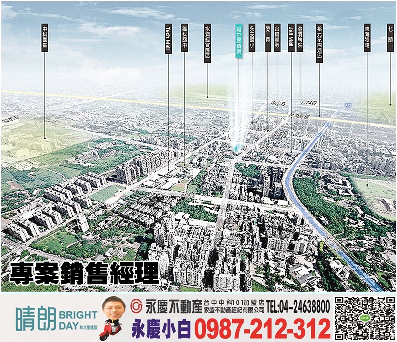 『和立堡晴朗』*中科生活圈核心特區,擁東海、靜宜、逢甲、弘光4座大學,緊鄰TECH Mall、J-Mall、遠東愛買、台糖、東海5大商圈,交通優勢佳,鄰近60米 中港路、中港交流道、二高、高鐵車站,地理優勢吸引科技公司主管、教授、醫生、科學園區就業人口購屋。