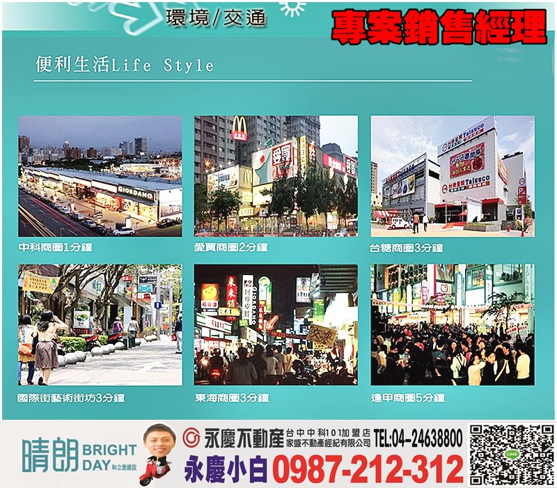 『和立堡晴朗』*生活機能 : 台糖量販台中店位中港路三段及J-Mall商圈、永福路上有愛買永福店、速食店及連鎖店、水堀頭黃昏市場、科紐約01商圈(各國料理餐廳都有)、楓康超市、國安一路及國安二路上樂橫丁市場。西屯路三段有松青超市宏台店及黃昏市場等,還有小吃店、餐飲店林立,裕元花園酒店位中港路、台中福華大飯店位安和路近中港路,採買、餐飲等生活機能充足..…商圈真的是說不完,這些商圈只要走路5~15分鐘真的是走不完。