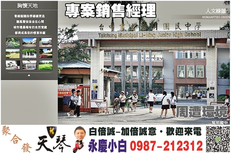 本團隊已在大台中深耕數十多年於七期、逢甲、12期、5期、8期、南屯嶺東、中科、新10期聯賣超強優值銷售團隊,同仁約有400位菁英戰將同仁同步銷售,是台中最強、最快銷售團隊,若是您有買賣屋..等不動產任何需求歡迎您找小白。也懇請您能給我們機會為您服務。