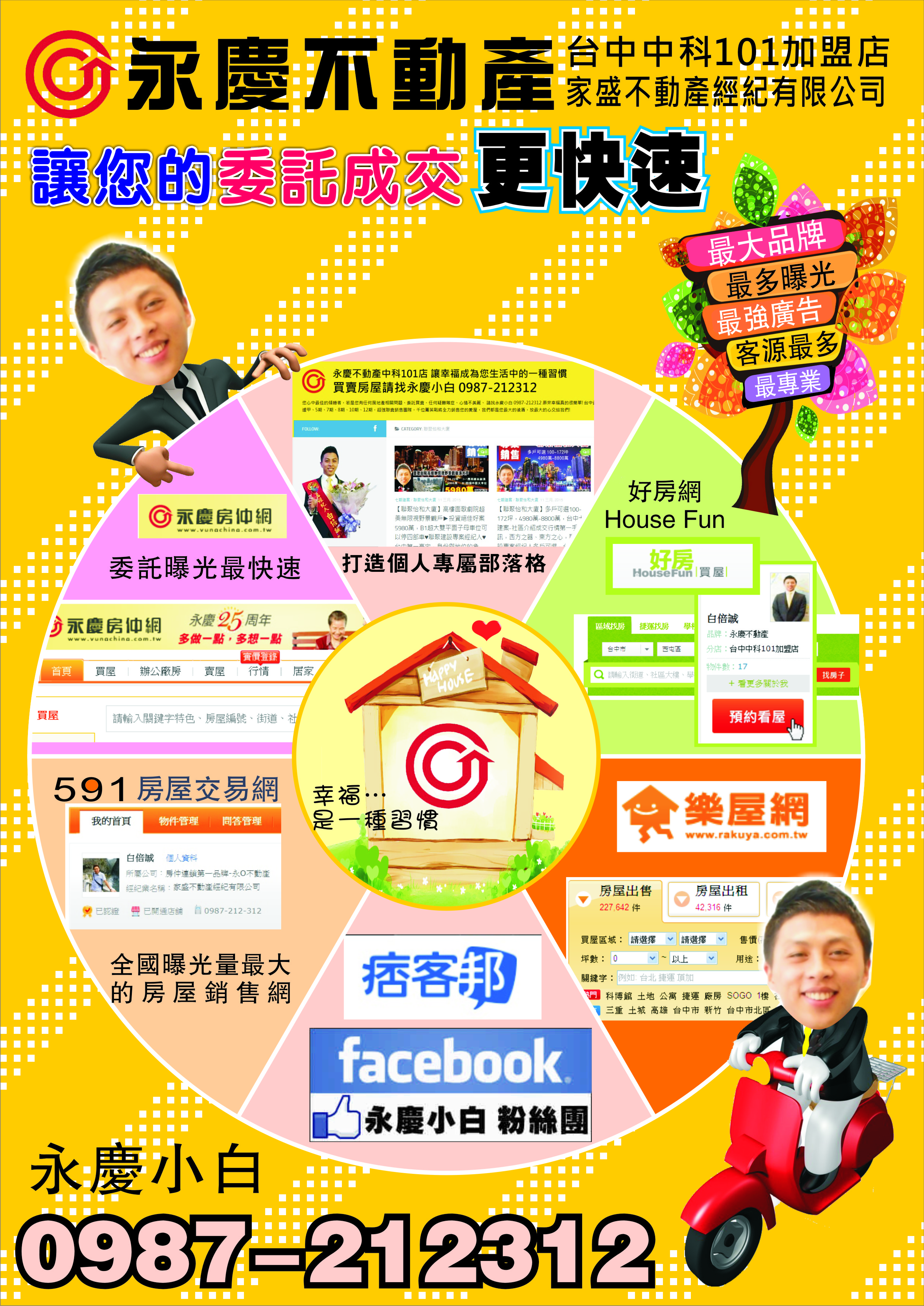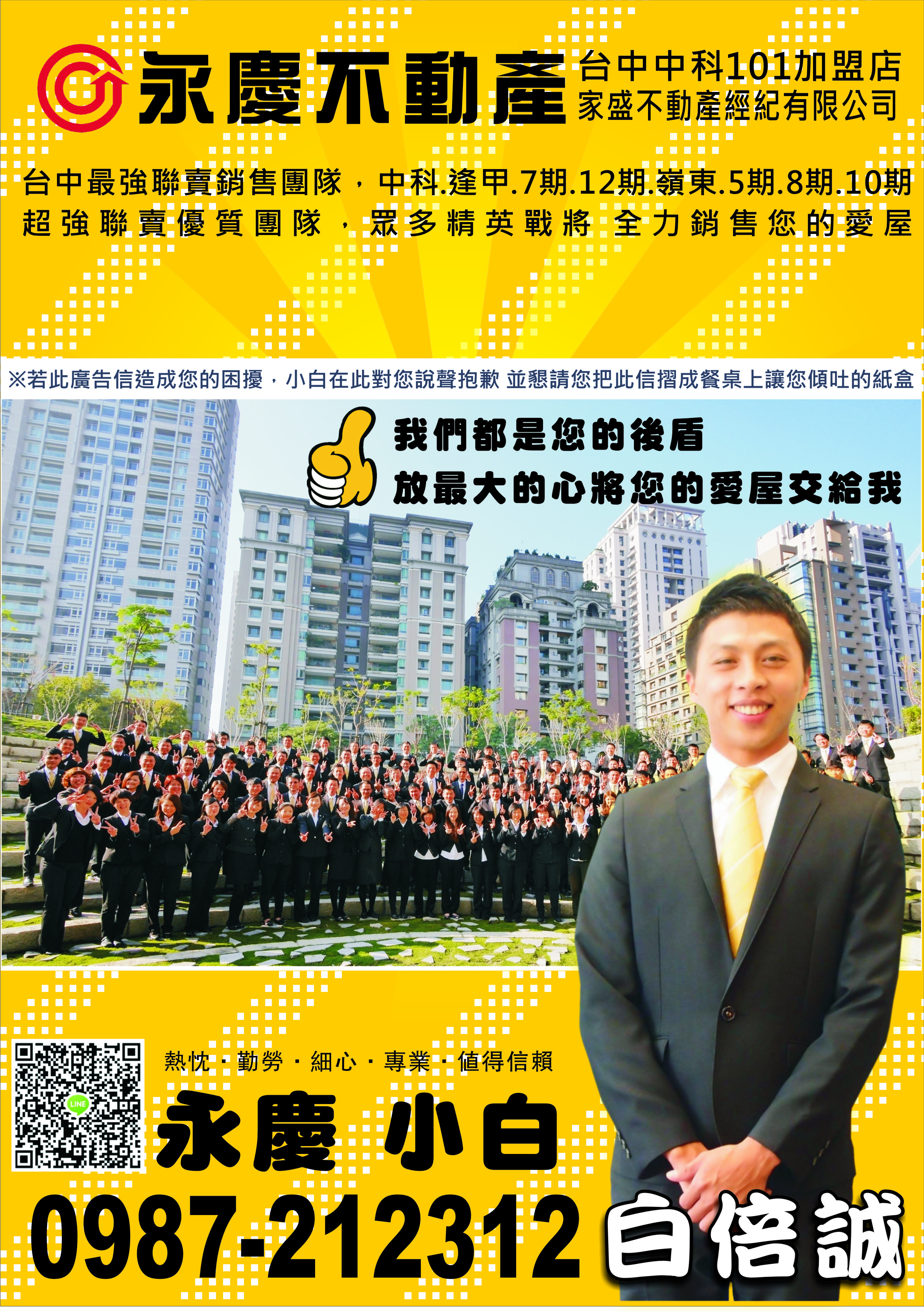 本團隊已在大台中深耕數十多年於北屯區、逢甲、12期、5期、7期、8期、南屯嶺東、中科、新10期聯賣超強優值銷售團隊,同仁約有400位菁英戰將同仁同步銷售,是台中最強、最快銷售團隊,若是您有買賣屋..等不動產任何需求歡迎您找小白。也懇請您能給我們機會為您服務。