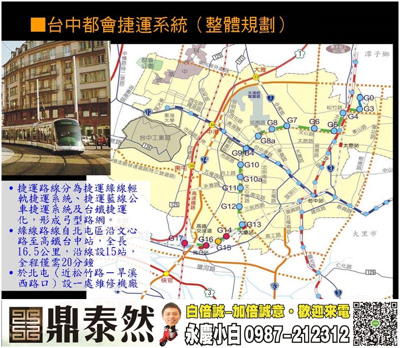 大台中捷運系統如火如荼展開,捷運烏日文心北屯線(綠線)開啟中台灣交通嶄新願景,預計興建十八個車站,最快2015年完工、2016年通車。其中「G4站」位於北屯路、松竹路口,連接未來台鐵松竹站(紅線),西側為松竹路生活圈,完善的機能,前景的看好,加上鄰近房價尚具補漲空間,被視為最具發展潛力的站別,增值後勢可期!