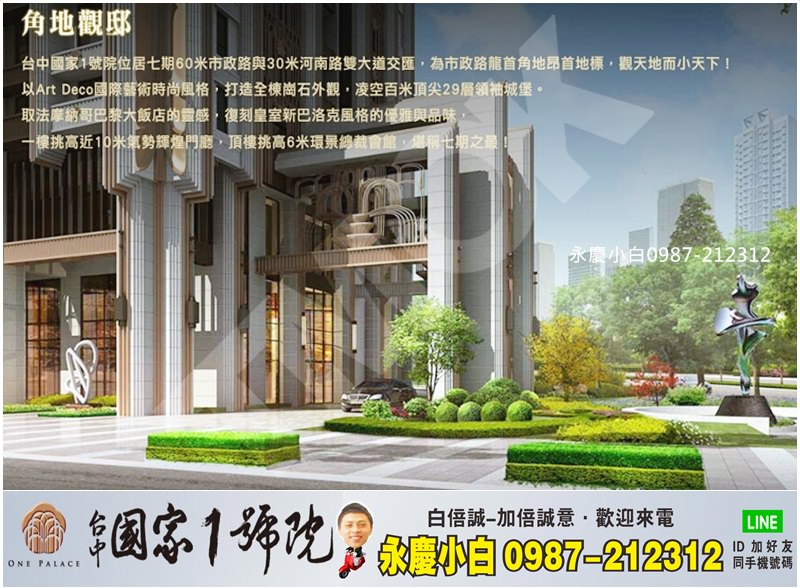 【特別企劃】興富發建設在台中市市政路、河南路口推豪宅新案「台中國家1號院」,樓高29層、全棟SRC崗石外觀,是60米市政大道上首棟地標型豪宅建築,國家級的設計品質,結合日本知名營建團隊大林組顧問,以Art Deco國際藝術風格設計,打造不一樣的豪宅
