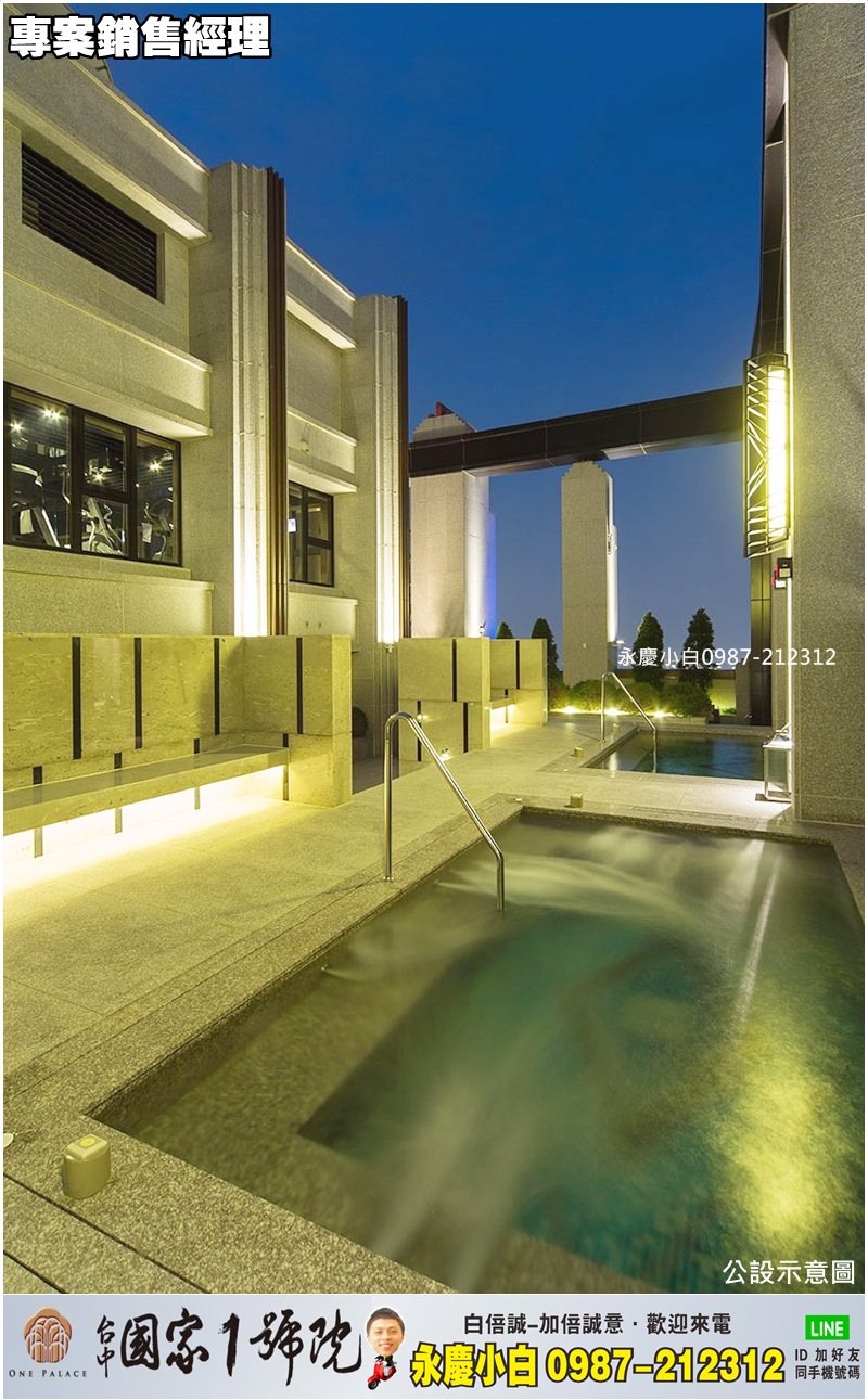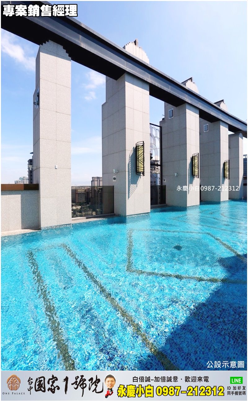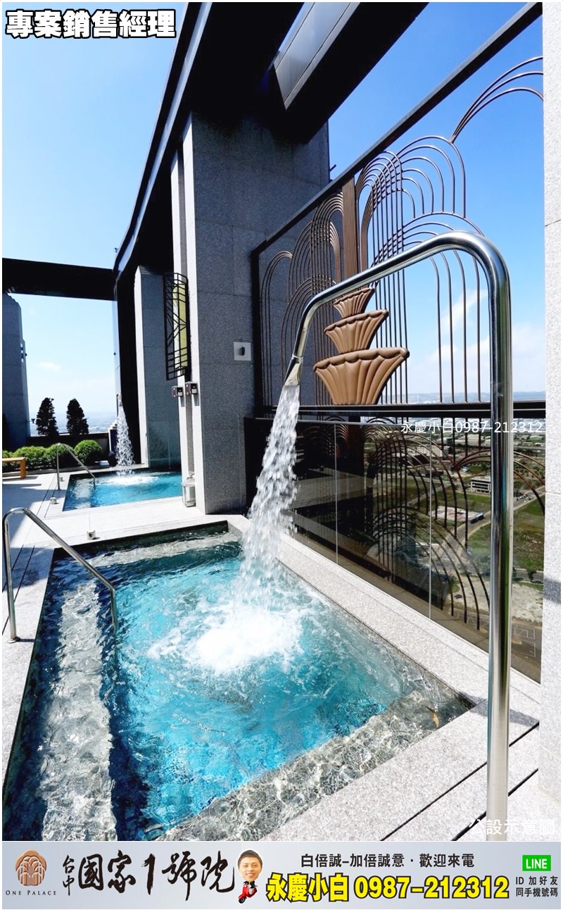 「台中國家1號院」規畫86至102坪,外觀選用純天然建材,結合戶外噴泉式的雕花欄杆,兼具通風與美觀;隱藏樑柱設計,兼顧結構安全,最叫人驚嘆的是頂樓「無邊際游泳池」、SPA區,邊游泳邊欣賞7期夜景,豪華氣派、隱密性夠,展現工程團隊建築實力。