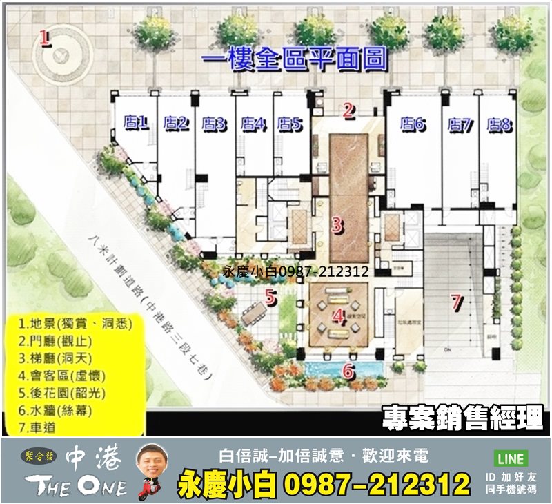 「中港The One 」社區門廳採二進式設計,規劃有門廳、社區廣場及8戶大樓店面,店面面寬4.4~ 6.7米、1樓挑高7.5米,本案周邊均為3~4層樓的低矮透天住家,6樓以上產品可分別眺望12期重劃區、潮洋環保公園、7期新市政中心與大肚山景觀。