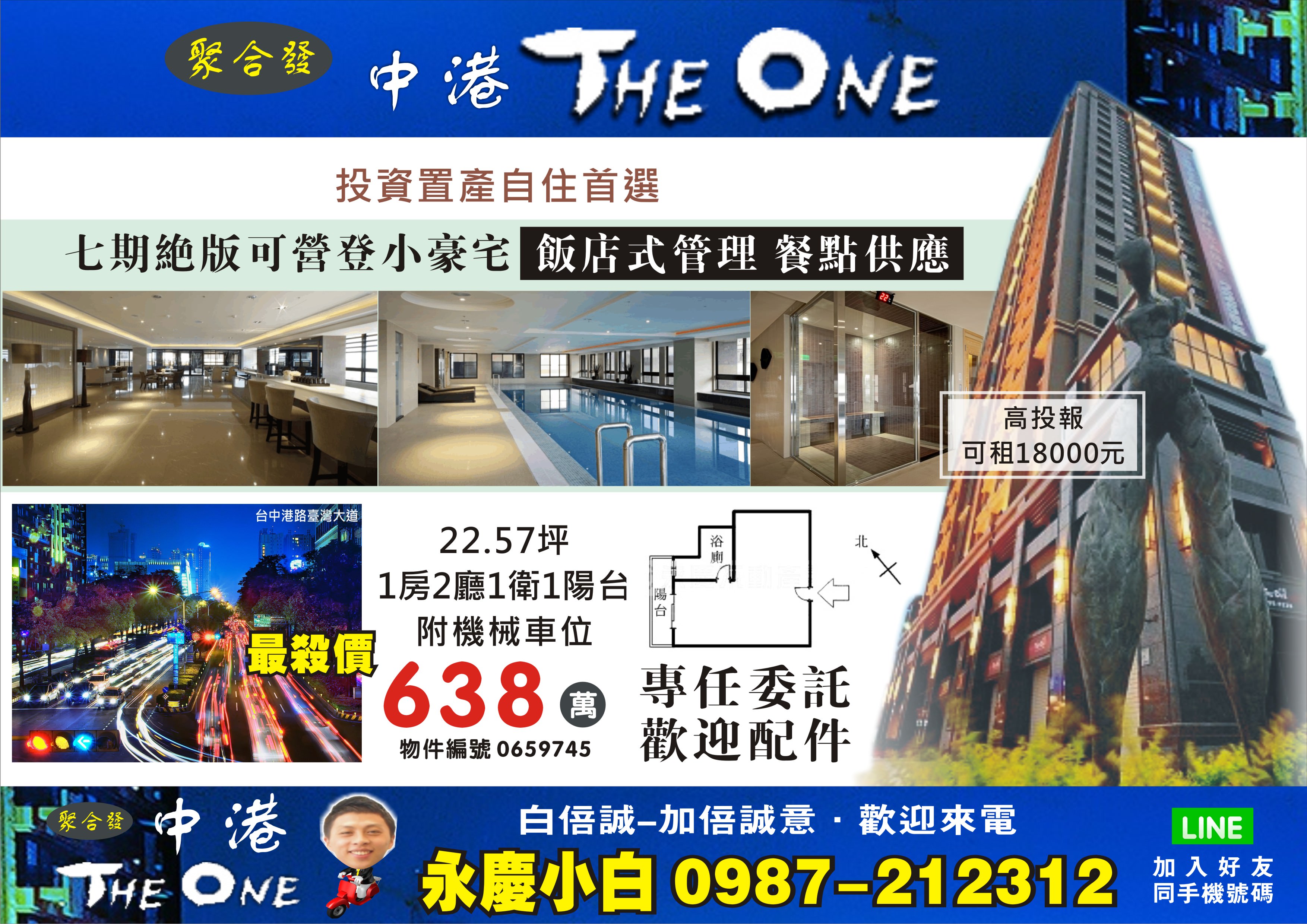 「聚合發中港The One 」台中市地標(台中市指標性大樓,台灣大道交流道下右手邊第一棟指標性大樓),南北交通便利,生活機能佳,7期唯一規劃小坪數豪宅個案,都市叢林中唯一淨土,四面景觀無限棟距,飯店式管理,全方位公設規劃,選定正台灣大道打造24層百米地標龍頭,重塑大台中門戶印象,原版移植沐蘭、水舞谷關之精品風尚,雕琢洽公休閒皆適宜的尊榮領域,以退縮式建築、雙塔地景與燈光計畫戶戶都是距離繁華最近的觀景席,精彩度絕對獨一無二。