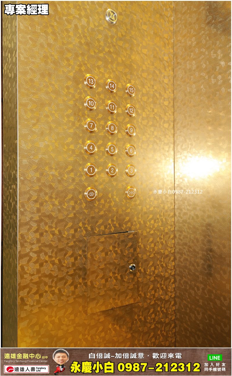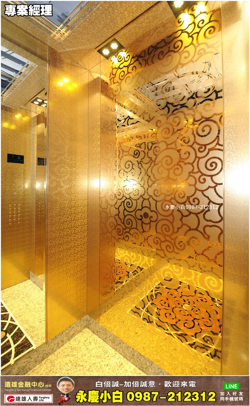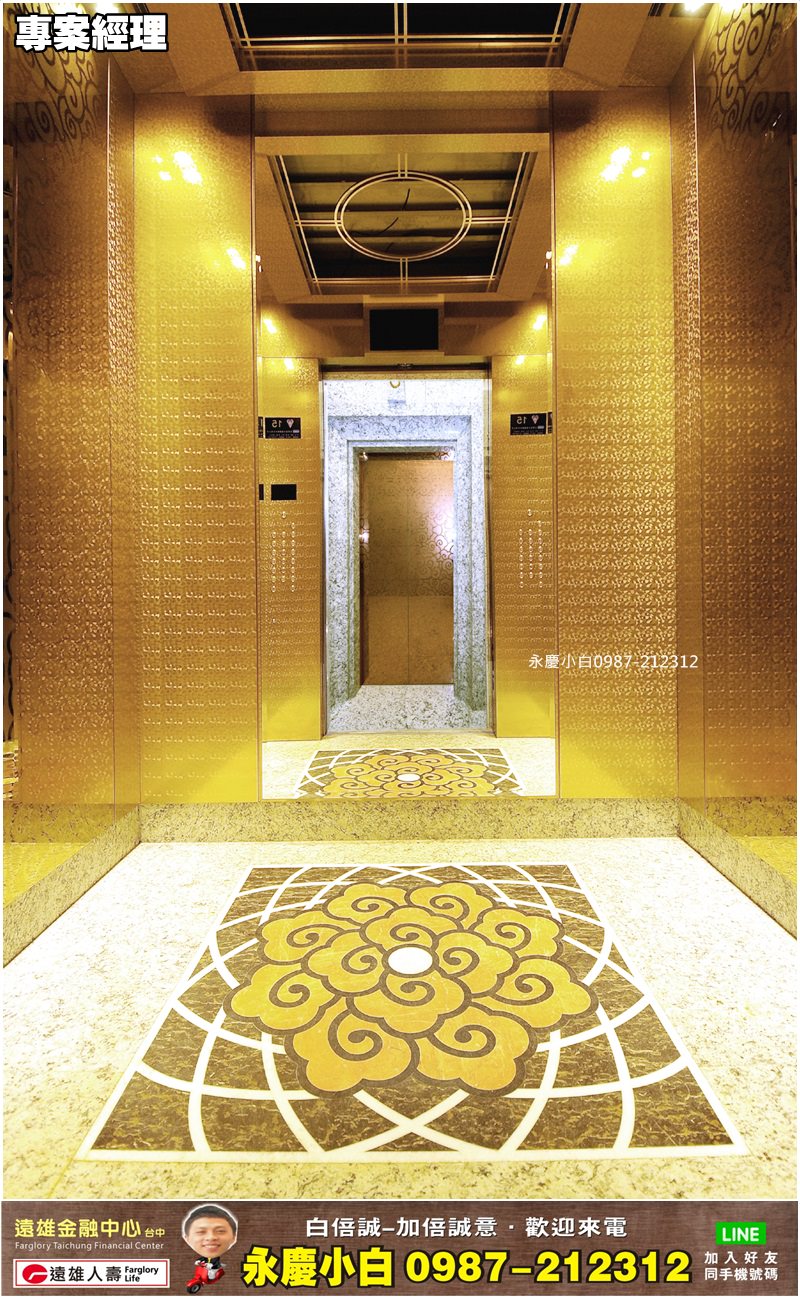 梯廳使用巴西花崗石材搭配金色如意圖像電梯。